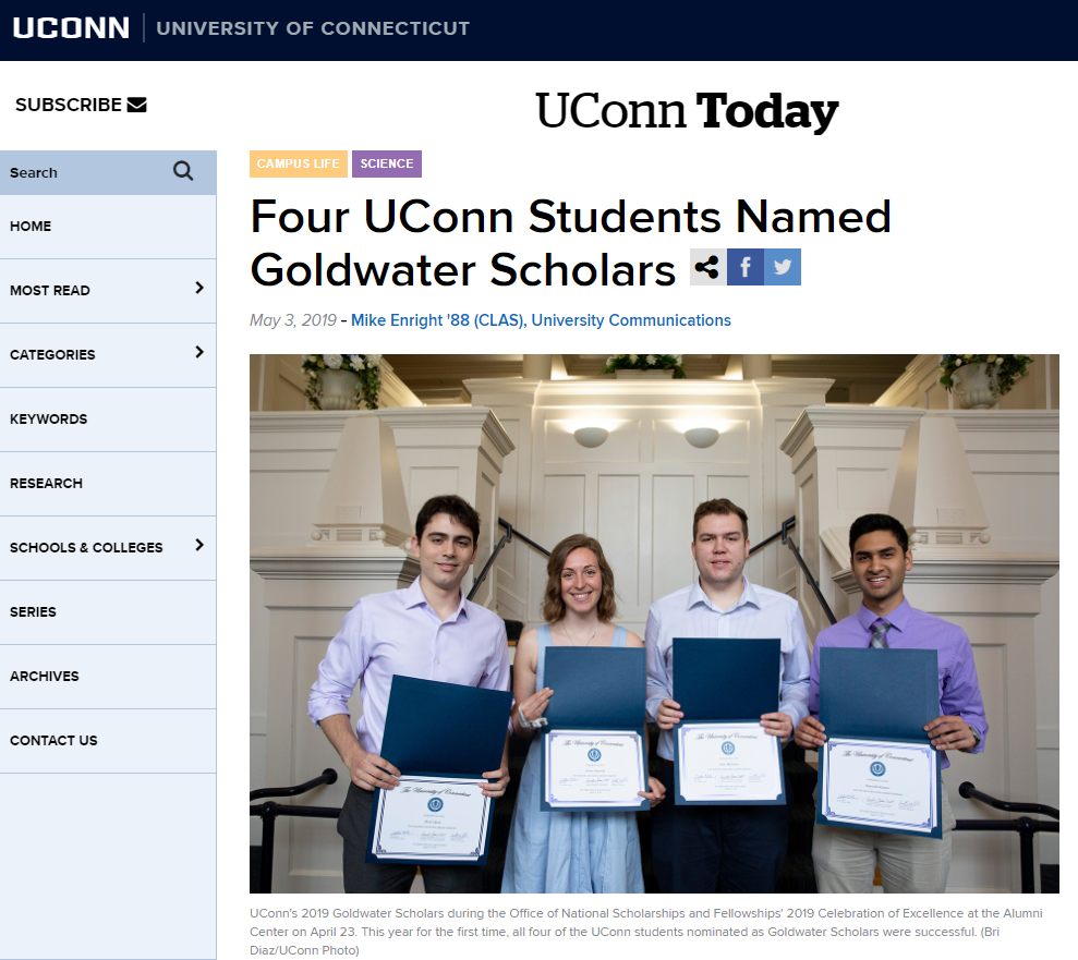 The University of Connecticut has produced four Goldwater Scholars in 2019 – marking the first time the school has had four winners in a single year. The Goldwater Scholarship is considered the nation’s premier scholarship for undergraduates studying math, natural sciences, and engineering. Schools can nominate a maximum of four students per year.