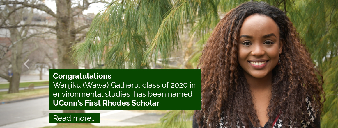 UConn nominated three students — Gatheru, Sophie MacDonald (’20 ENG), and Himaja Nagireddy (’20 CLAS) — for the 2019 competition.   With the result, Gatheru becomes UConn’s 7th Udall Scholar, and first since Ecology and Evolutionary Biology major Nick Russo (’18 CLAS) won in 2016.  She is also the first UConn student to win both the Truman Scholarship and Udall Scholarship in the same year.  Colin Carlson won the Udall as a sophomore in 2011 and the Truman as a junior in 2012.  Four of this year’s Udall Scholars attend colleges or universities in New England, but UConn is the only public institution in the region to have nominated one of this year’s winners.