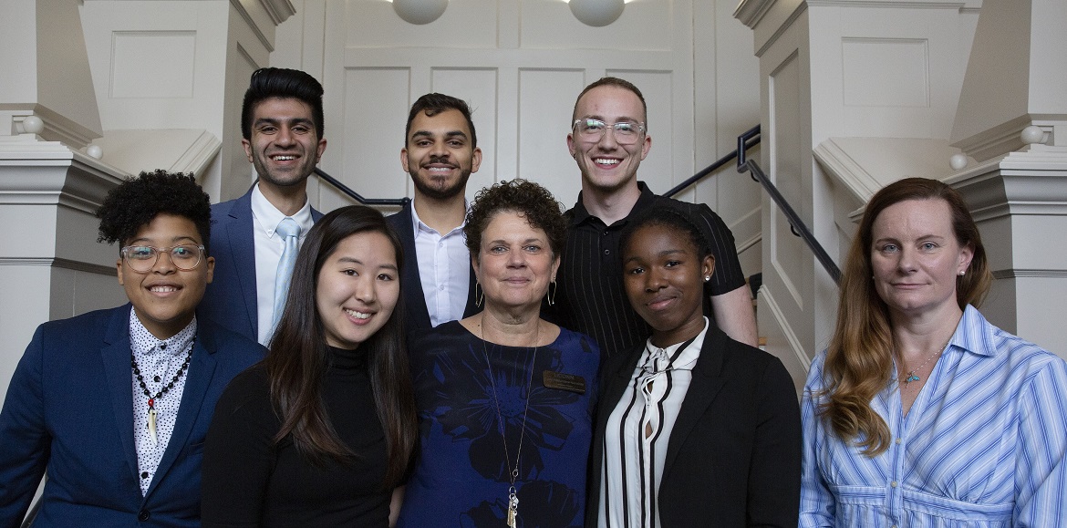 Fulbright US Student Program 2019-20 Semifinalists & Finalists, with Fulbright Program Advisor LuAnn Saunders-Kanabay, at ONSF’s Celebration of Nominees breakfast, April 23, 2019.  Pictured from left to right are Chriss Sneed, Sahil Laul, Angela Kang, Dhruv Shah, LuAnn Saunders-Kanabay, Omar Taweh, Brianna McClure, and Kim Sawicki