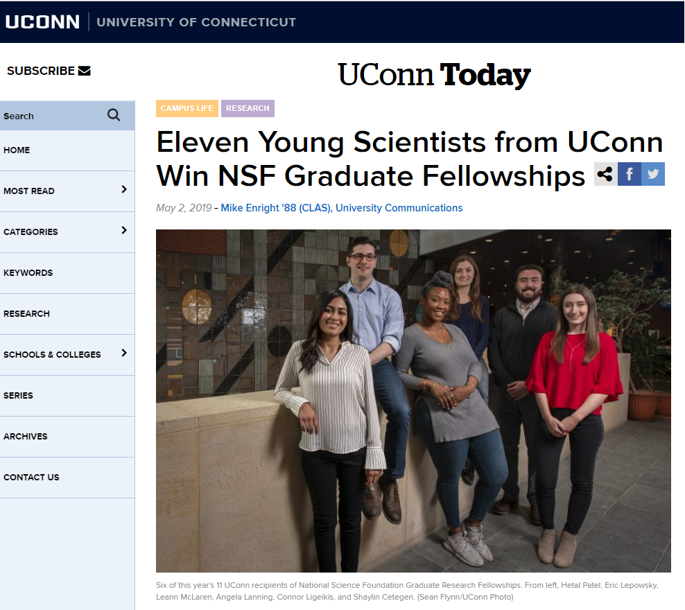 Four UConn undergraduates, two graduate students, and five alumni have won National Science Foundation Graduate Research Fellowships (NSF-GRFP).  The oldest graduate fellowship of its kind, the NSF-GRFP recognizes and supports outstanding graduate students in NSF-supported STEM fields who are pursuing research-based master’s and doctoral degrees at accredited institutions in the United States.