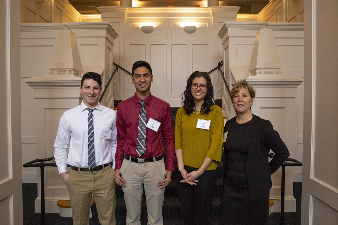 Goldwater Scholarship nominees (l to r) Andrew Levin, Saurabh Kumar , and Sarah Ferrigno, with Goldwater Scholarship nominating committee chair Prof. Joanne Conover. Nominee Daniel Zeigher not pictured. Taken at the ONSF Celebration of Excellence breakfast, April 25, 2018. (Bri Diaz/UConn Photo)